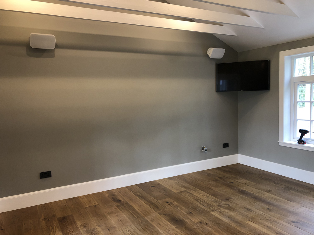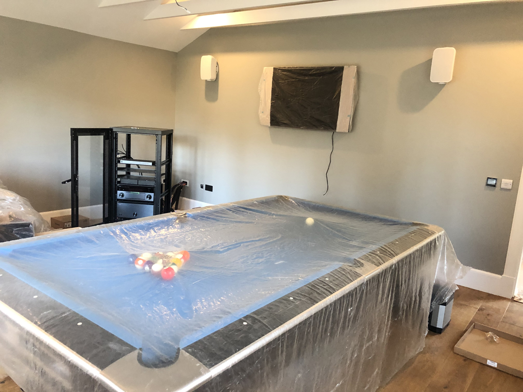 Games room with Sonos Architectural speakers, 4k TV and equipment cabinet.